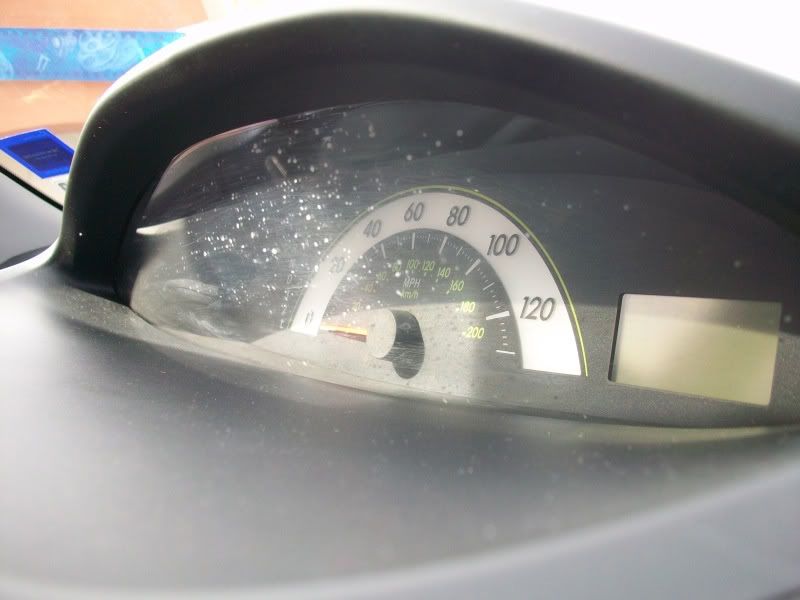 Ah! Okay, since I first got my Yaris, I've taken well care of it. I've cleaned it and washed it almost every week because of where I live. It's very dry, dusty, and we don't have well paved roads or anything. So I'm guessing one day, my dad was cleaning the inside applying armor-all or something and it hit the plastic part of the dash cluster? i'm not sure exactly what its called in english.. But here are some pics. I guess he didn't wipe it off and with the heat, the drops went into the plastic leaving behind these ugly marks.