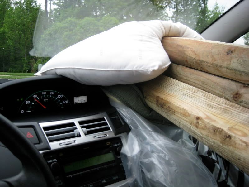 600 hp just on the wood alone... then you have domo kun, and that's another 100, easy.I bet that thing KILLS vets! Just kidding. Smart with the pillows though. I brought home some wood and some other stuff in my car awhile back, and all I did was bend the stuff so it went from the passenger side floor board to the drivers side rear, in that little niche back there. Worked well at the time.