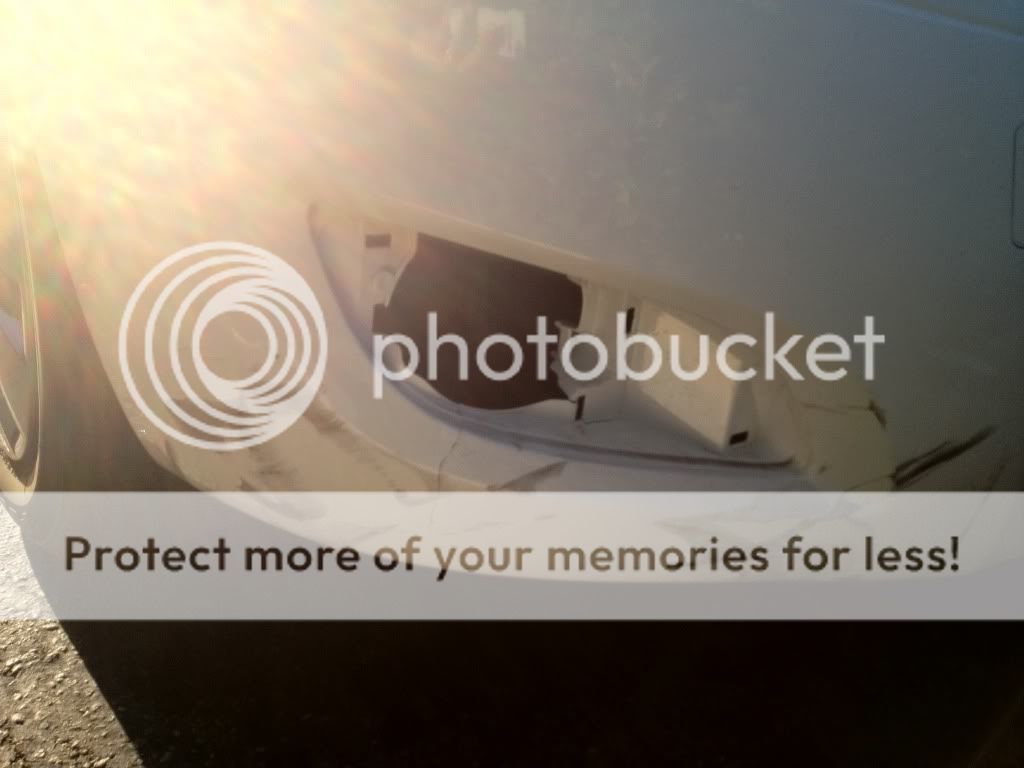 So, I was driving behind a truck when I decided to switch lanes to the left. I look over my shoulder to see the lane is clear and as I turn back and start switching lanes the truck in front of me switches lanes to the right and reveals a cone in the road. Too late, my options are either run it over or swerve into the cars next to me. A loud bump later and I'm left with a cracked bumper. The little black piece covering where the foglight would be fell off and my windshield wiper reserve tank leaked as well. =[