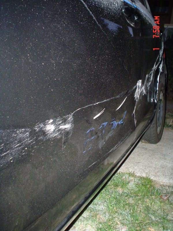 Well this morning at about 6:45 I am awoken by a loud crash and my 2 way alarm going off. I run outside in my boxers to see that my car has been hit. Some guy in an escalade had just hit my car hard!!! Once he saw me he left the scene. F&%^$R!!!