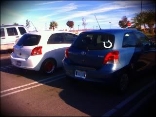 Ok guys help me out. Heres a picture of my yaris, not the greatest I know. I'm debadging it, and getting it tinted. I want to get some smoke LED tail-lights, and lower it about 2 inches. (Mine is on the right.)
