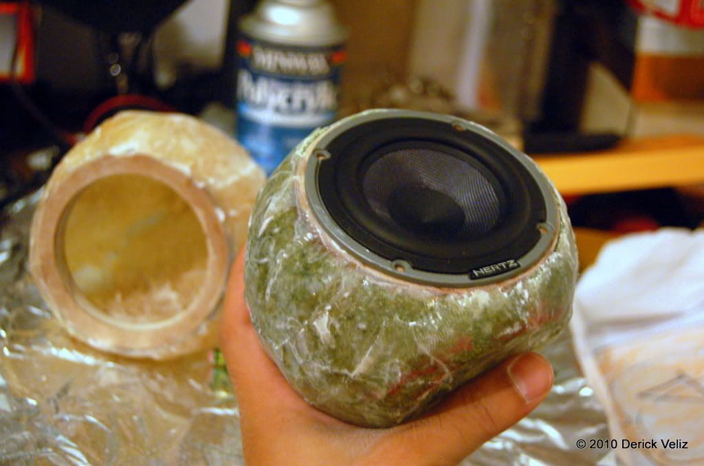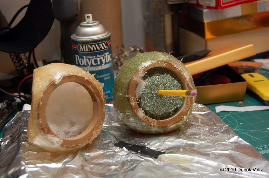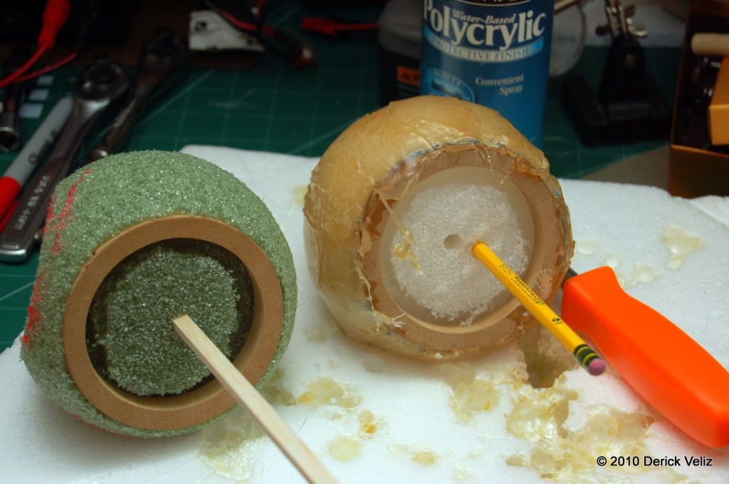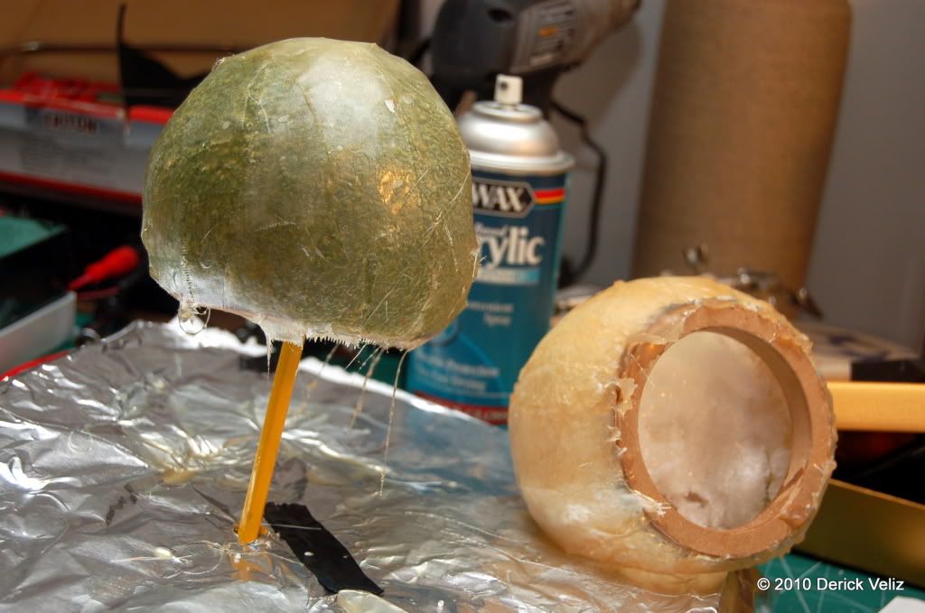 I did work once with resin and fiberglass about 20 years ago, I remember the smell (it was a little patch for a small speaker box I made). I cut the fiberglass in 1" stripes, I mixed 2oz of resin with 20 drops of ???? I don't know what is the proper name in Spanish is "catalytic"? I'll read the bottle tomorrow and edit this post. Yeah it's MEKP! The mix proportions was less than the instructions 1oz = 10 drops Instructions require 1oz=12 drops. I did this just to aloud me more time, they way I look at it is more drops... less time to work! I applied a little bit of resin and a stripe of fiberglass at a time, until the ball was all covered, tomorrow I'll try to do the second one (green ball) then I'll start sanding and applying some bondo and then sand again. We'll see how it goes! ![]() ![]() ![]() D.
