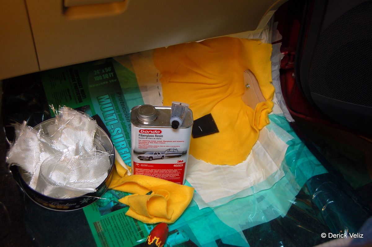 OK, besides getting down there and doing some Yoga... the most difficult part was applying the resin on the upper section/vertical areas. The fleece just kept sticking everywhere out of place. I guess I need to be more aggressive and not to be afraid to work with more than 6 oz of resin at a time. D.