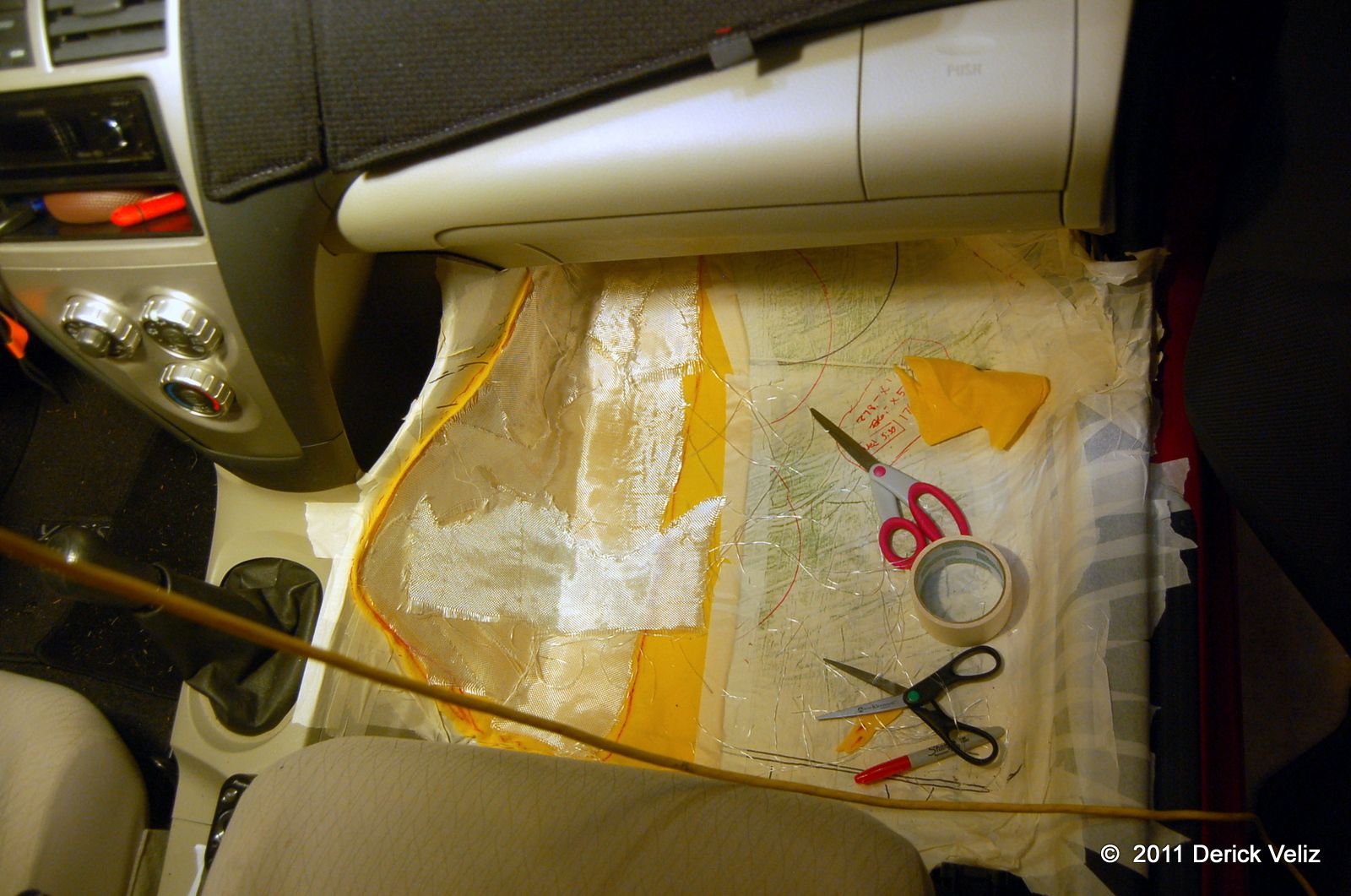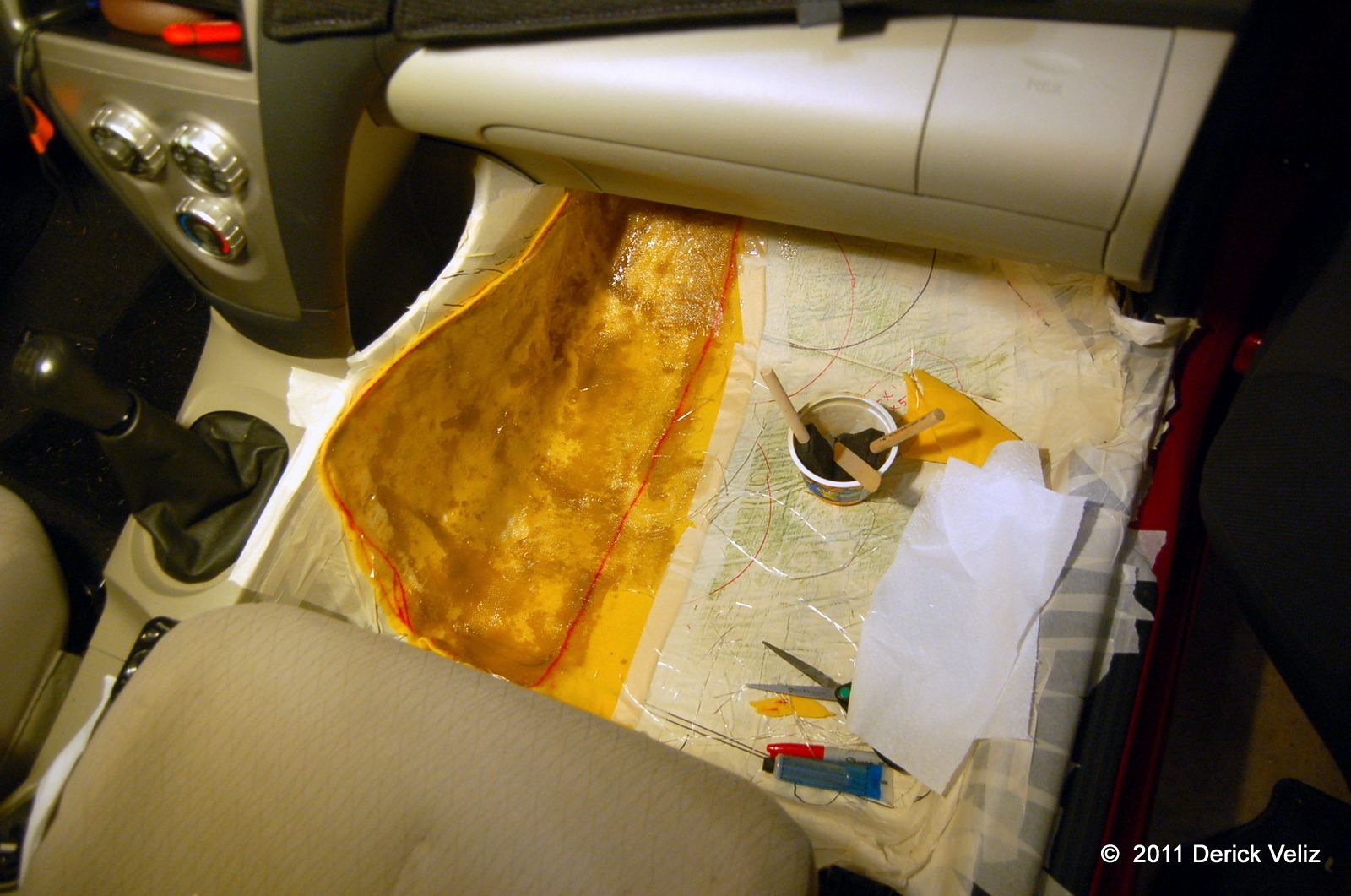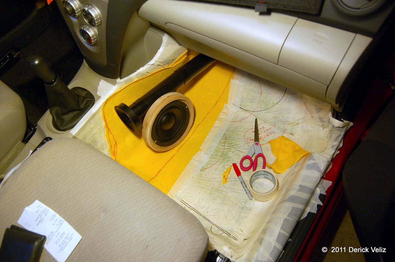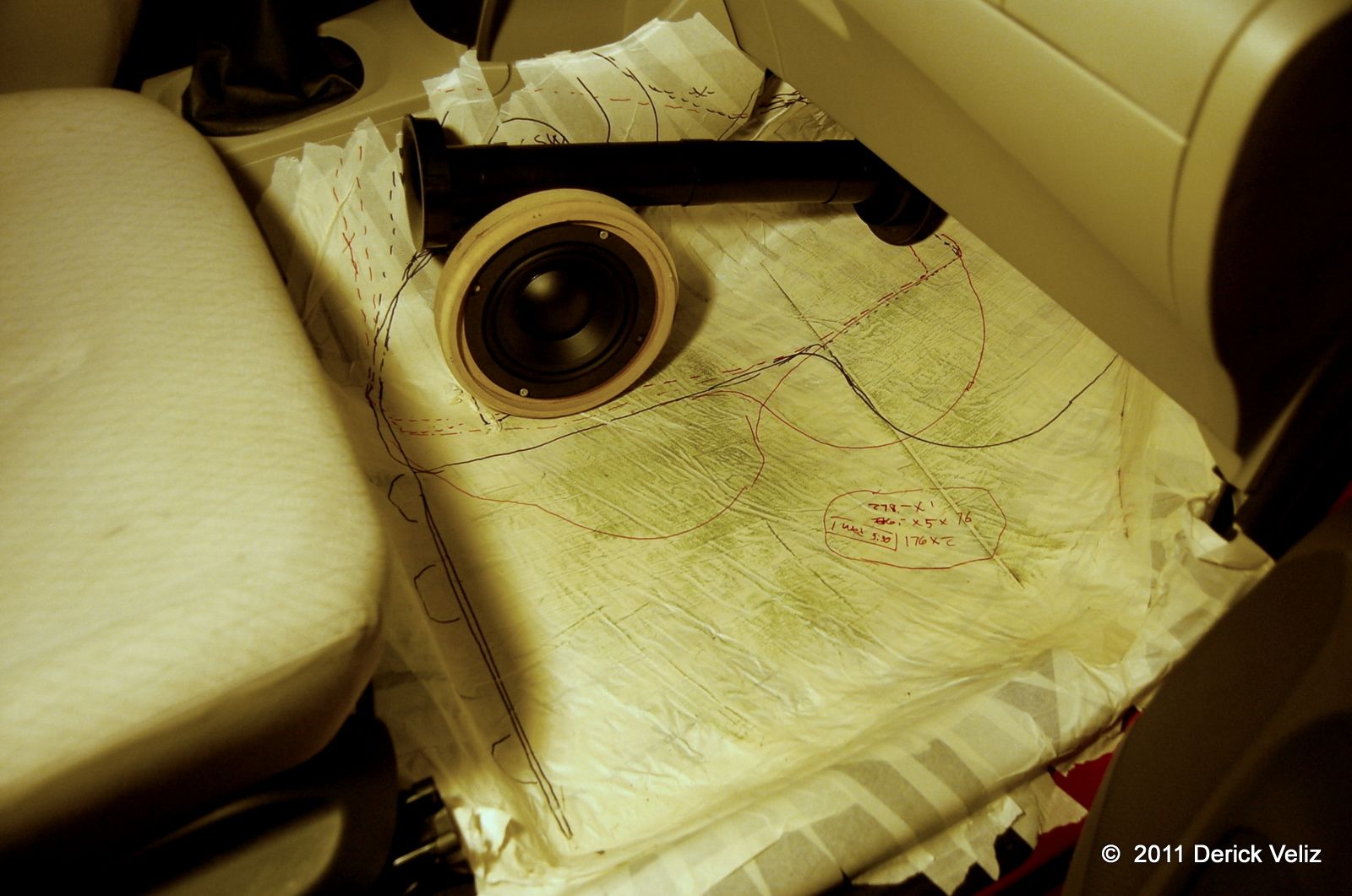 This new option, I think it's a keeper with a smaller foot print and just above the 0.35 cubic feet of internal air, the woofer facing the passenger's side and a straight vent towards the fire-wall: ![]() ![]() Some spray 3M super 77 and fleece: ![]() ![]() ![]() ![]() Last night I did 2 more layers on the vertical side and trimmed the edges, so far is gaining weight. D. .