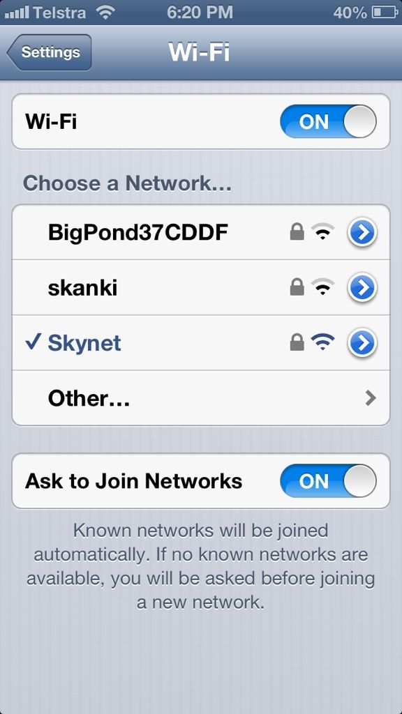 ![]() I went with "Skynet". Mainly because of the Terminator 2 link and that "Pretty Fly For A WI FI" would not show up on my iPhone 5 screen, it was shortened to Pretty Fly Fo..... Which I thought looked crap. Thanks for the input people's.