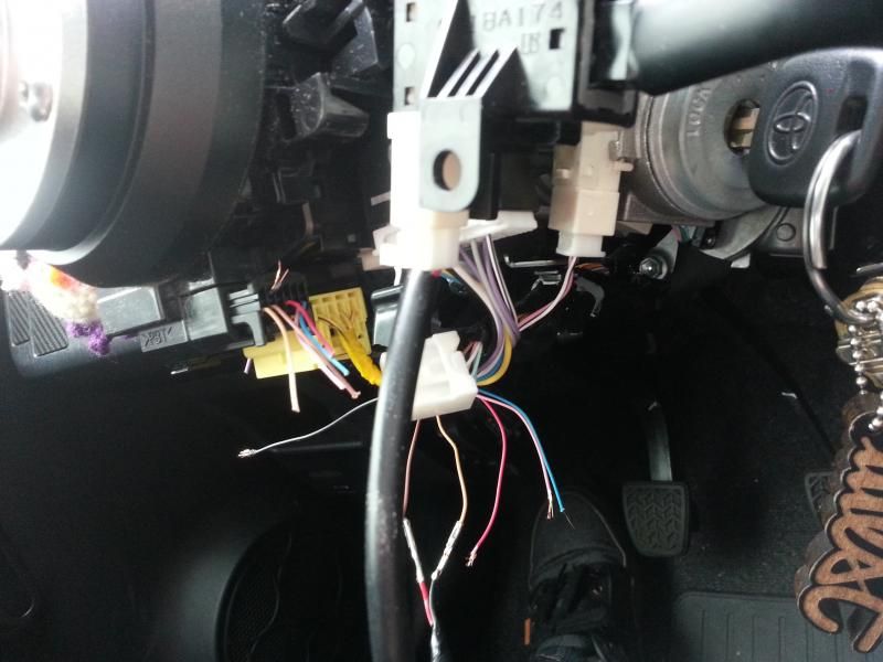 so, since i had no idea at first which wire was what, I started just putting wires into the CC. I removed the plug from the end of the CC wiring harness to get the metal plugs to be exposed, as my first plan was to just plug them into the clockspring harness. that idea failed. Oh well. I started with a blue wire that had a single piece of wire inside. seemed to make sense to me. tried all the other ones, then all of a sudden.....HONK HONNNNK. turns out the thickest wire in there is the horn! I made the cruise control power button a horn. I laughed. I'll just move that wire up out of the way for now. (before all this I found a plug with three wires, and tried that, by pushing the metal ends into it. I found the wiper washer harness. CC sprayed my window. lol. It's not pictured)