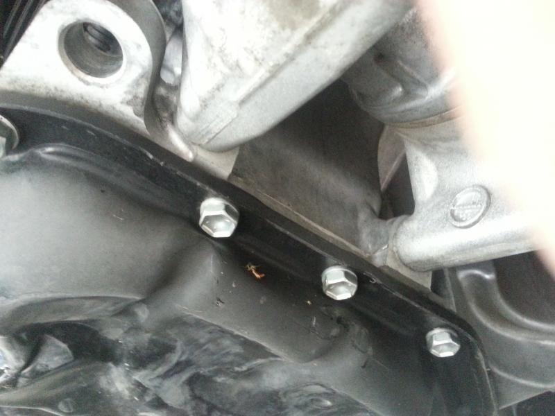 Step two: start removing oil pan bolts. Easy enough, except for one stud (there are two studs with nuts on them, I'm assuming for "make this job easier" when you put a new pan on. that stud had hit the center divider and bent. pulled the whole stud out, replaced with bolt.