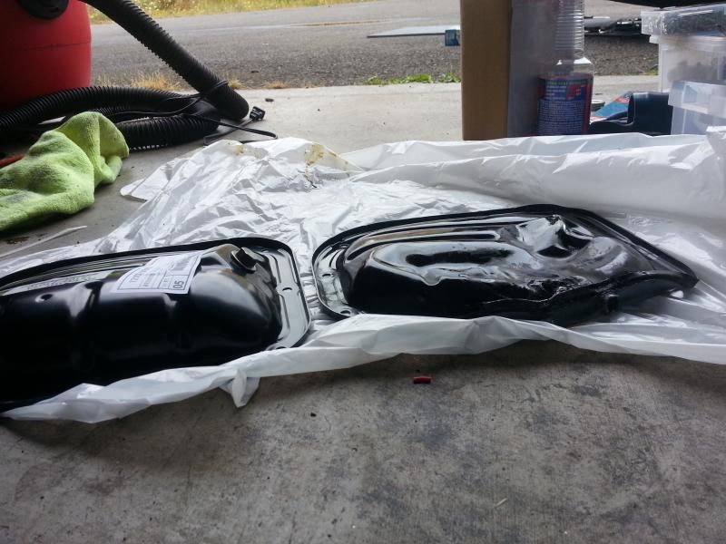 few minutes of that and I heard a scary *POP*. one of the bolt holes an the pan ripped! YAY. then it was easy from there. just spun it to get the last one off. Everything up in the engine looks great. the oil pickup tube didn't get touched. Dry it all off, and put some RTV on the new pan. slapped that beauty back on and tomorrow after it's dry i'll fill it up with oil!