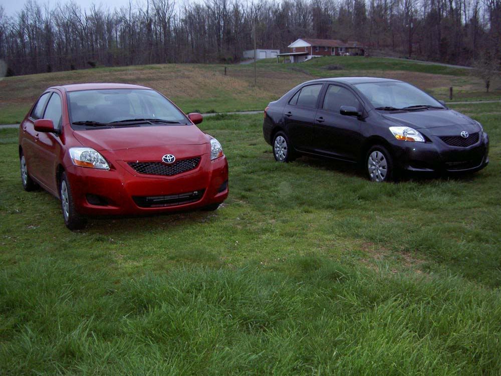 Here's a shot of my son's Yaris (Barcelona Red Metallic) and mine (Flint Mica). I bought mine four weeks to the day after helping my son, Wes, negotiate the deal on his. It was his first time to buy a new car on his own, and he wanted me to help him get a good deal.