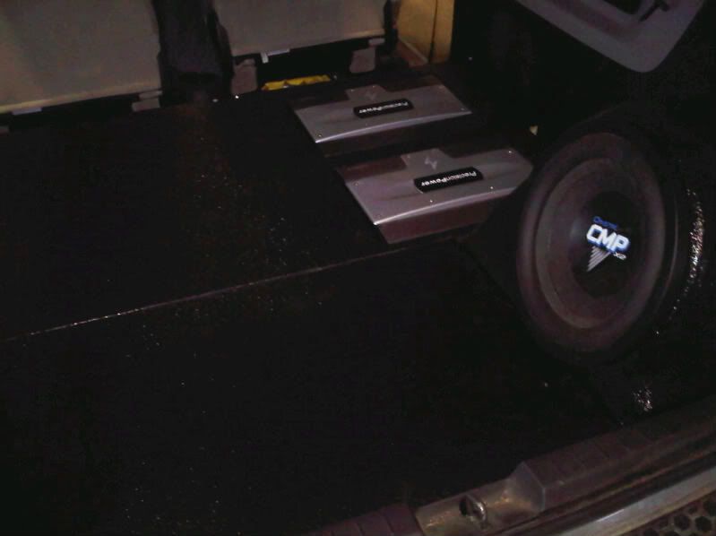so i got bored with my old setup and decided to do some fiberglassing and rhino lining for just throwing cargo in the rear. here is my finished product. sorry i was using my camera phone. i will take better pics later.