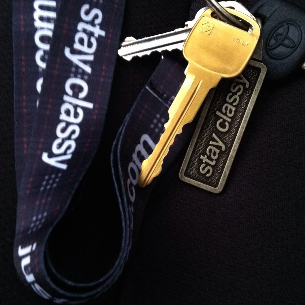 Titanium gold Miata key with 'Stay Classy' keychain/lanyard. Yaris key is there lurking in the background. ![]()