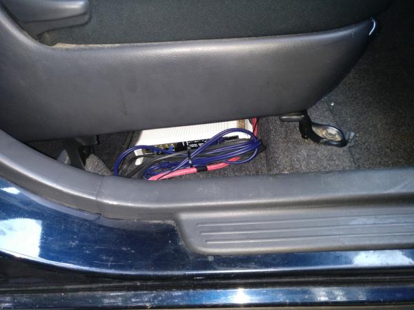 i forget to get a amp shot. it is under the passenger seat with 4 gauge power wire. fused at the battery. this runs into the cabin at the bulk head where the main harness comes through the firewall. it travels under the dash and too the door jam molding, the trigger wire and sub out RCAs takes a similar path from the head unit. a notch was made in the door jam molding at the rear of the passenger seat for the power cables to come out. the amp ground cable is wrapped around the front of one of the seat bolts and i used a weld on copper terminal here filled with lead and mounted it under the seat bolt. (seat bolt and inner mount where wire wheeled clean to make sure a good body connection for ground was made.) the subwoofer connection is 12 gauge copper wire runs back under the door jam trims and is well hidden, comes out in the storage area and plugs into a store bought box (i was in a hurry.) the amp and sub are all professional audio equipment i had left over from when i used to do installs. the amp is MMATS and was rebuilt about 2 years ago, the sub is MMATS also and was rebuilt about 6 years ago and stored after rebuild. (pro equipment is rebuildable, not disposable like a lot of the garbage 'audio shops' sell now)