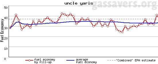 ![]() this chart has the lifetime fuel economy for my yaris, which is mostly city driven, the low dips in the chart correspond with the winter time. lifetime fuel economy of 33.4 mpg 90 day running average of 34.11 mpg. |