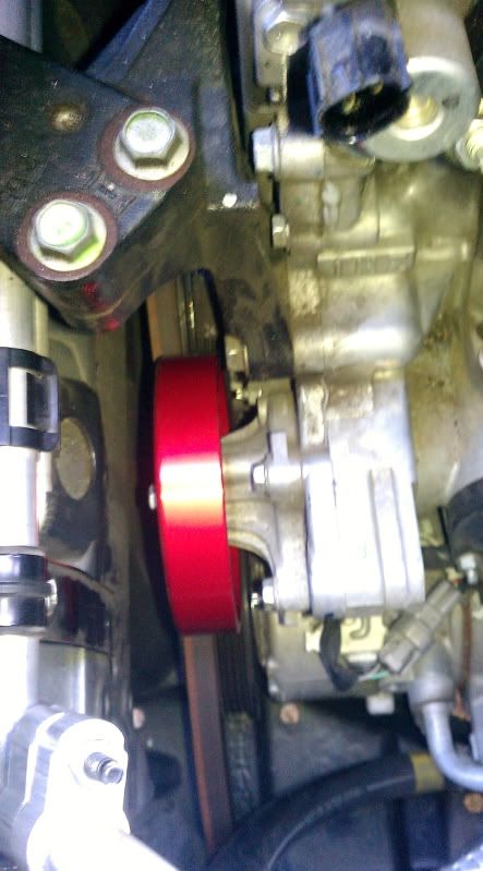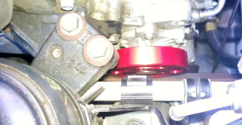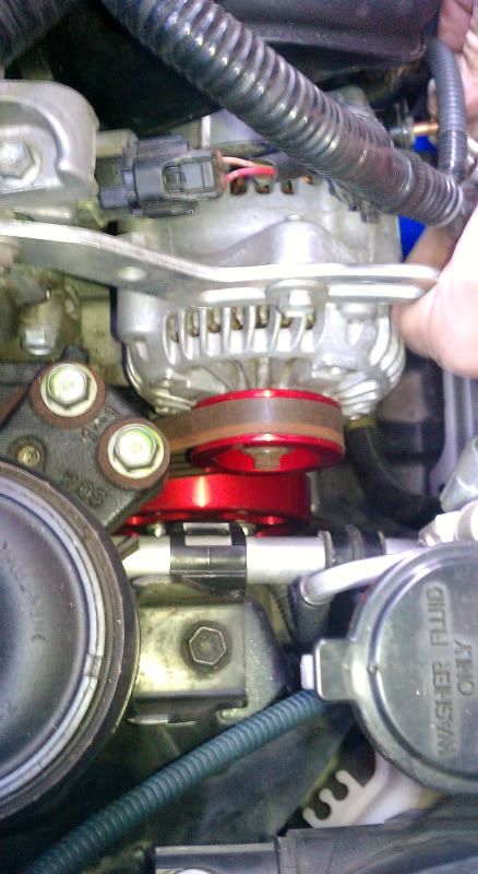 ![]() ![]() ![]() ![]() All in all the install took less than an hour,used an impact gun to pull the alternator pully,the waterpump pully you just use a screwdriver or in my case a socket extension and stick it in the pully holes and undo the 3 bolts. To pull the alternator bolt holding it to the motor you have to undo the fastner screw for the AC line and move it slightly out of the way to get bolt out to pull alternator.Used 22mm impact socket and impact gun to pull pully,it once the nut is off just pulls off with your hand,no puller needed. LIke I said I think just sheer dumb luck I blew the fuse,going to pull the aftermarket terminal and put stock on back on and get a ring for the 0/1 amp wire and mount it to the stock terminal.Pully install on a scale of 1-10 I would say is a 3 tops,very easy to do as long as you have a buddy with an impact gun.Another option would be a 22mm offset box wrench and then hold the shaft with think it was 12mm and it also will come right off. |