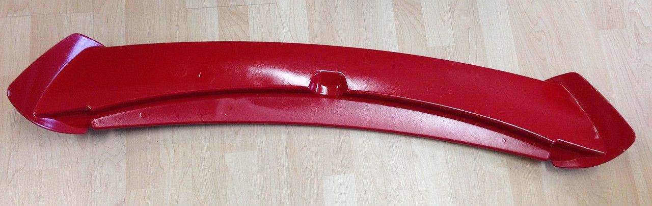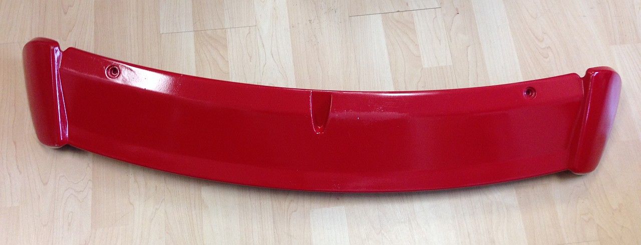 This is one of the ebay clone rally spoilers. It has two mounting holes to bolt it to the hatch, but most people just mount them with 3M heavy duty double sided tape. I purchased it a few months ago, intending to put it on my red Yaris. I painted it with three coats of color matched 3P0 paint (from automotivetouchup.com) and then clear coated it. Right after I finished spraying the clear, a gust of wind knocked it off the stand I was painting it on and with still-wet clear it landed in the grass. At that point I gave up, as I was out of the factory matched paint. So, it needs to be repainted... $30 + shipping ![]()